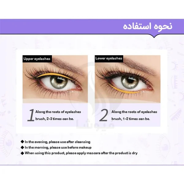 - بعد از پاکسازی کامل چشم و مژه، 3 تا 5 قطره از این سرم را روی ریشه مژه یا ابرو بچکانید.