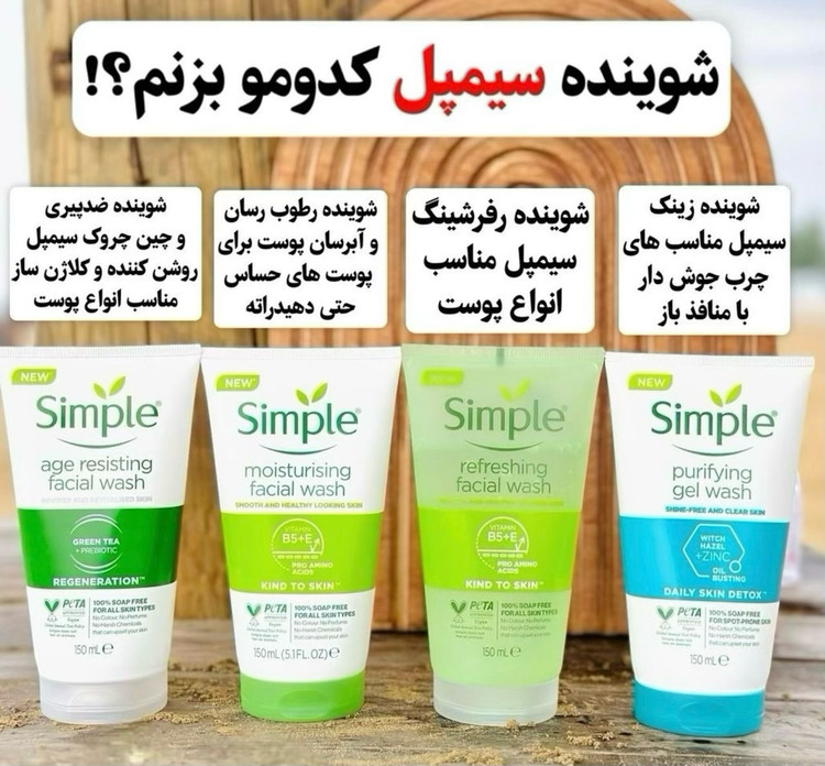 ژل شستشو ضد پیری سیمپل حاوی عصاره چای سبز و بابونه است که گزینه بسیار مناسبی برای انواع پوست از جمله پوست چرب و آکنه دار است .